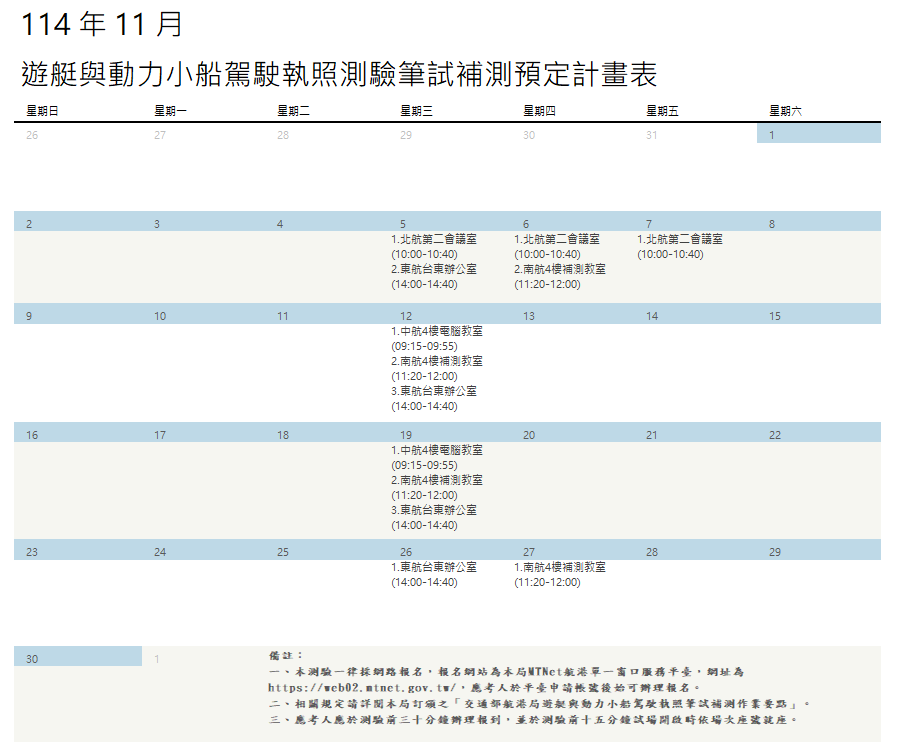 114年11月遊艇與動力小船駕駛執照測驗筆試補測預定計畫表