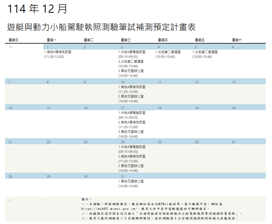 114年12月遊艇與動力小船駕駛執照測驗筆試補測預定計畫表